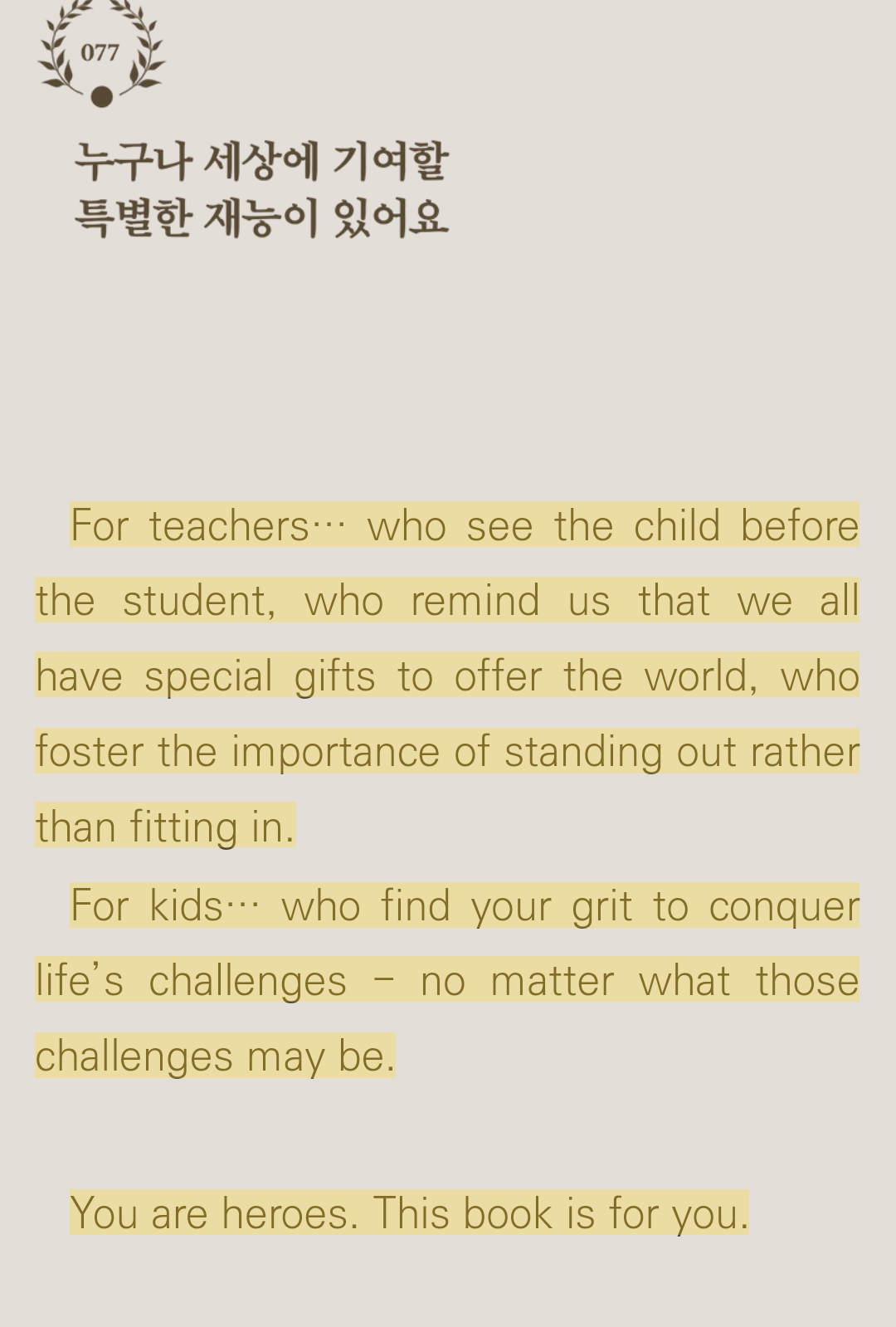 하지만 우리는 서로 다르다는 거를 인정하는 것이 중요하다. 서로 다름을 인정하고 화합하려는 자세는 아이들에게 꼭 필요한 가치관이다. 특히 나무 위에 물고기(Fish in the tree)는 아이들에게 그러한 가치관을 심어주고 존재의 소중함 자존감을 일깨어 주어야 한다고 하면서 교육관을 심어주는 책이다. 누구나 세상에 기여할 수 있는 특별한 재능(gifts)을 가지고 있음을 알려준다. 모두 자기만의 달란트를 가지고 태어나는 것이다. 서로가 서로를 존중해야 한다.