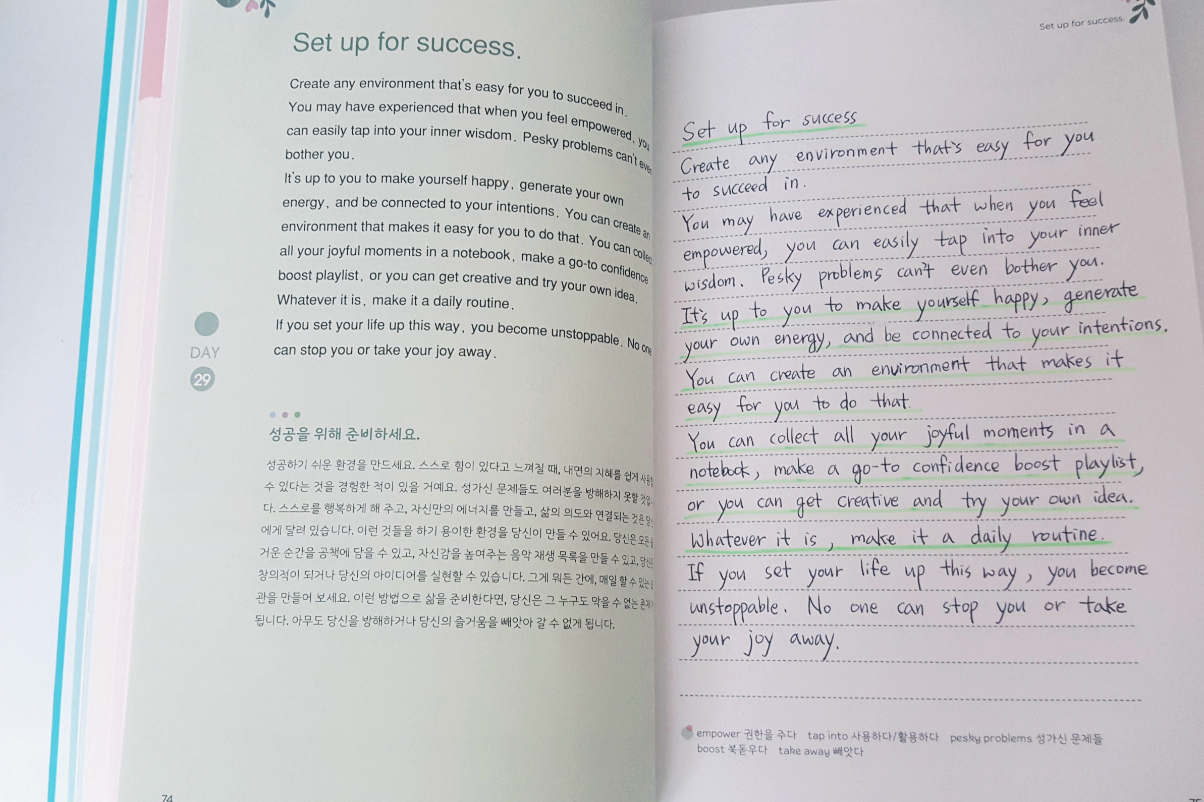 스스로 힘이 있다고 느껴질 때, 내면의 지혜를 쉽게 사용할수 있다는 것을 경험한 적이 있을 거예요. 성가신 문제들도 여러분을 방해하지 못할 것입니다. 스스로를 행복하게 해 주고, 자신만의 에너지를 만들고, 삶의 의도와 연결되는 것은 당신에게 달려 있습니다. 이런 것들을 하기 용이한 환경을 당신이 만들 수 있어요. 당신은 모든 즐거운 순간을 공책에 담을 수 있고, 자신감을 높여주는 음악 재생 목록을 만들 수 있고, 당신의 창의적이 된거나 당신의 아이디어를 실현할 수 있습니다. 그게 뭐든 간에, 매일 할 수 있는 습관을 만들어 보세요. 이런 방법으로 삶을 준비한다면, 당신은 그 누구도 막을 수 없는 존재가 됩니다. 아무도 당신을 방해하거나 당신의 즐거움을 빼앗아 갈 수 없게 됩니다.