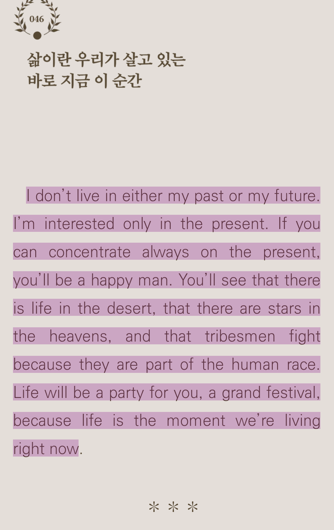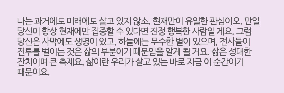 우리는 과거와 미래 사이의 현재를 살고 있다. 현재는 영어로 present 이고 present의 또 다른 의미는 선물이다. 그만큼 현재가 과거가 되고 또 미래가 현재가 되기에 현재를 어떻게 사는냐가 과거와 미래를 좌우하고 있기에 우리는 현재에 충실해야한다. 현재를 값지게 살때 과거와 미래 또한 값지게 살 수 있다. 과거 현재 미래 중 현재가 제일 중요하다는 의미이다. 우리는 현재에 집중하고 현재를 나에게 주어진 선물인 듯 충실하게 대한다면 우리의 삶을 더욱 가치 있게 만들 수 있다. 현재 바로 이 순간 나는 삶을 어떻게 대하고 있는지 성찰해 보고 우리는 삶을 대하는 자세를 바로잡고 삶에 태도를 올바르게 한다면 한결 더 가치 있는 삶을 살아 갈 수 있을 것이다. 현재 바로 지금의 나의 삶의 태도를 살피는 것이 무엇보다 우선이다.